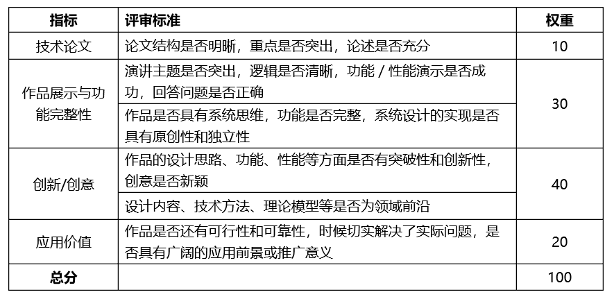 3.现场评审方式要求参赛队携带参赛作品和作品展板于统一时间集中到指定地点,展示作品功能,进行分组答辩。评委根据技术论文、作品展示情况和答辩情况进行评审。