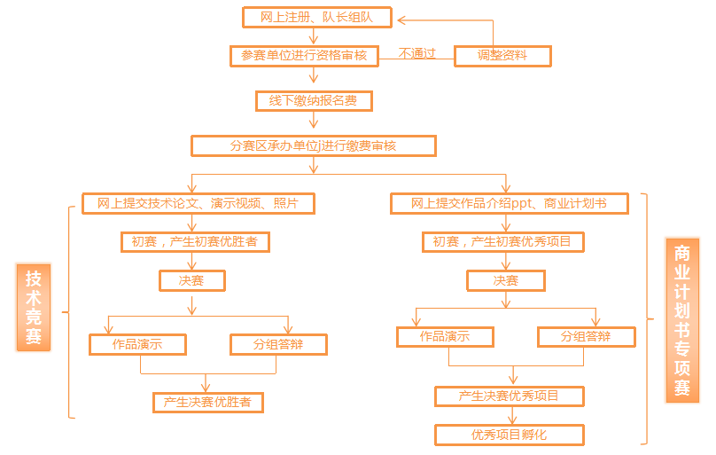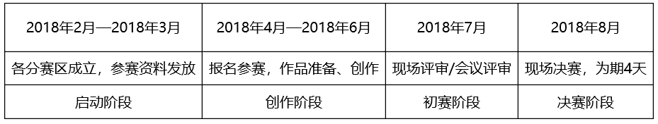 竞赛分六个阶段:竞赛筹备;分赛区成立与竞赛宣传;参赛报名及参赛作品收集;分赛区初赛;决赛现场评审及颁奖;竞赛总结。具体参赛流程如下: